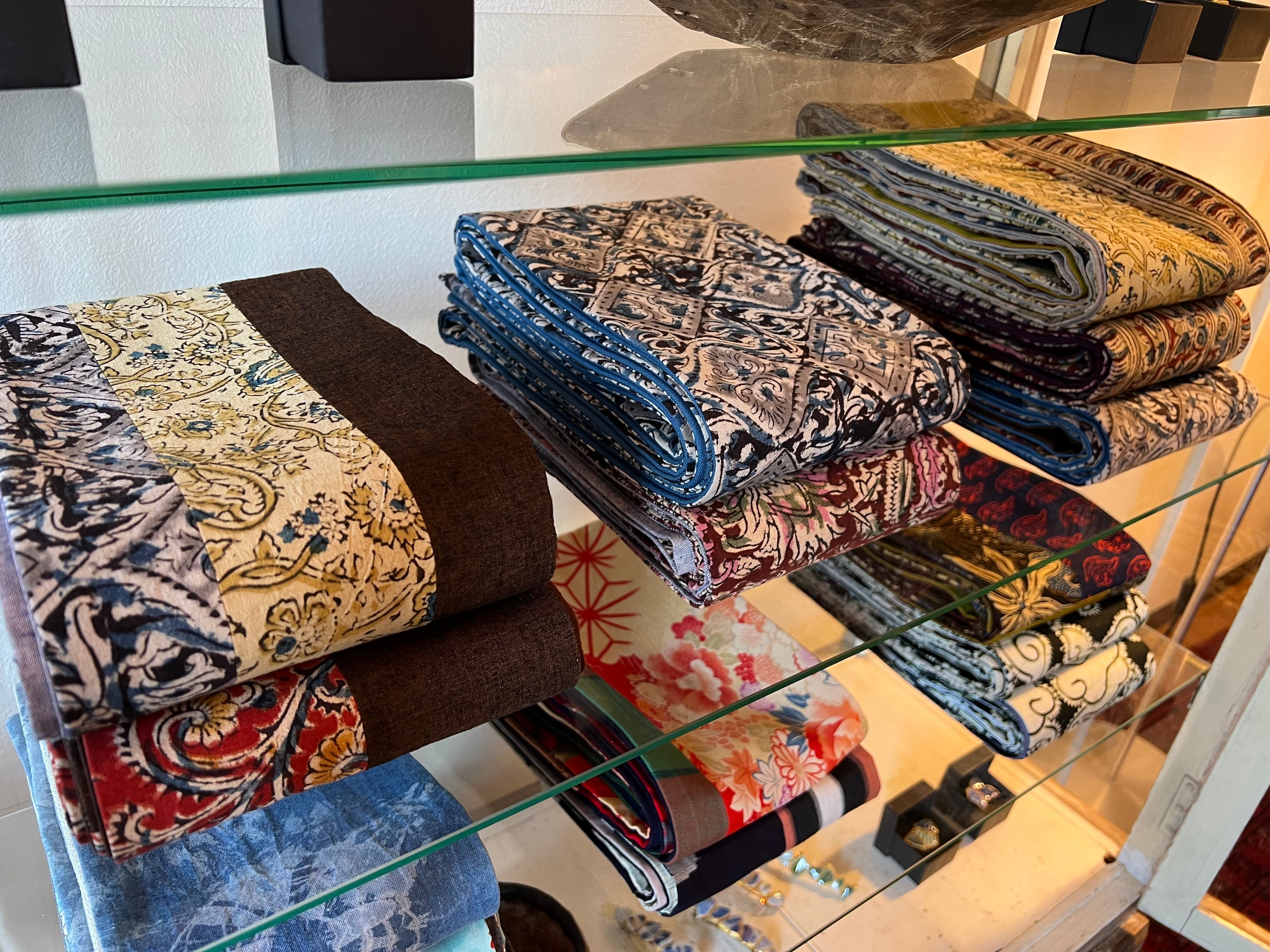 カラムカリは、インドに古くから伝わる染色技法で、植物由来の染料を使って布に模様を描き出す生地です。