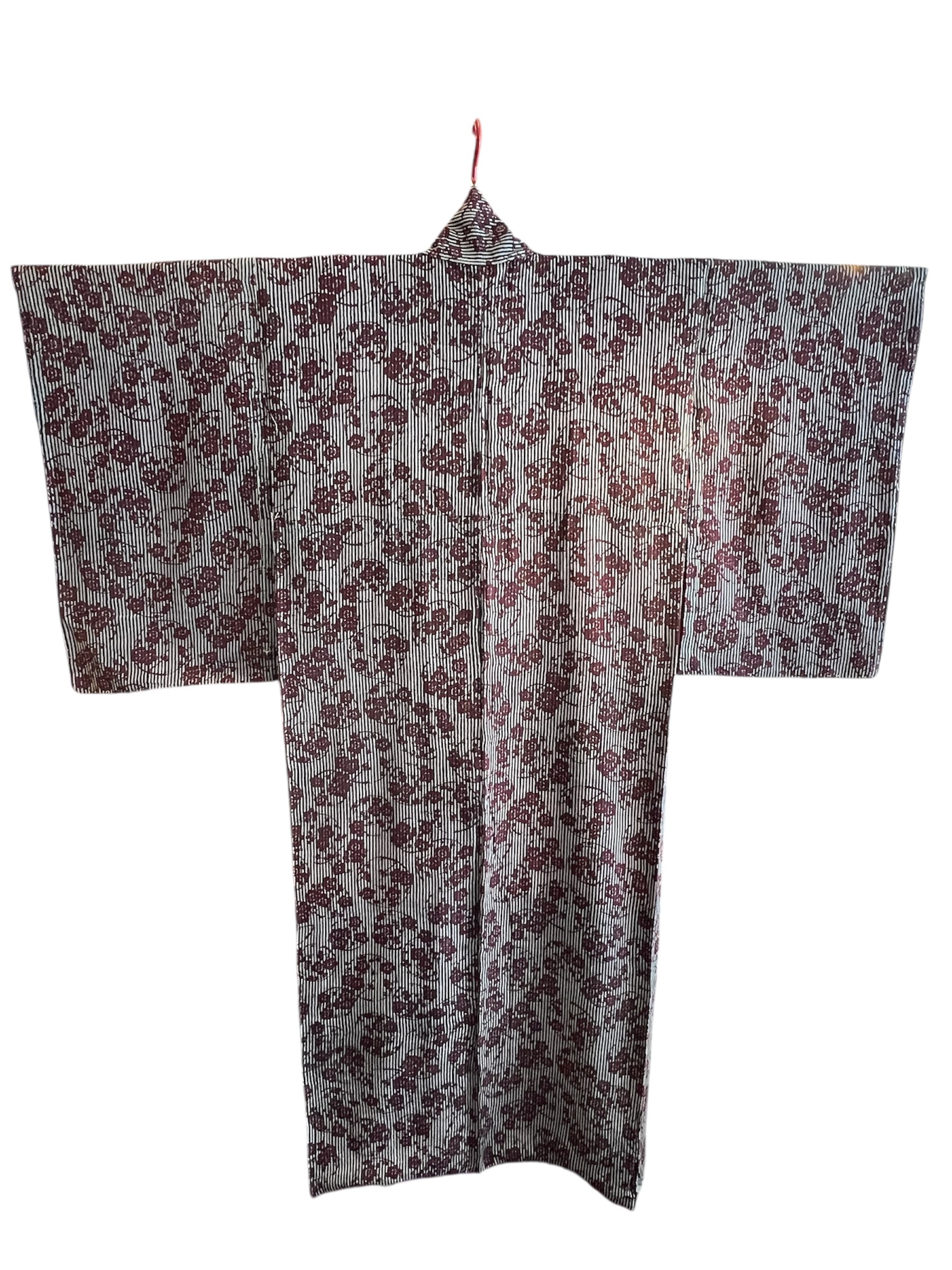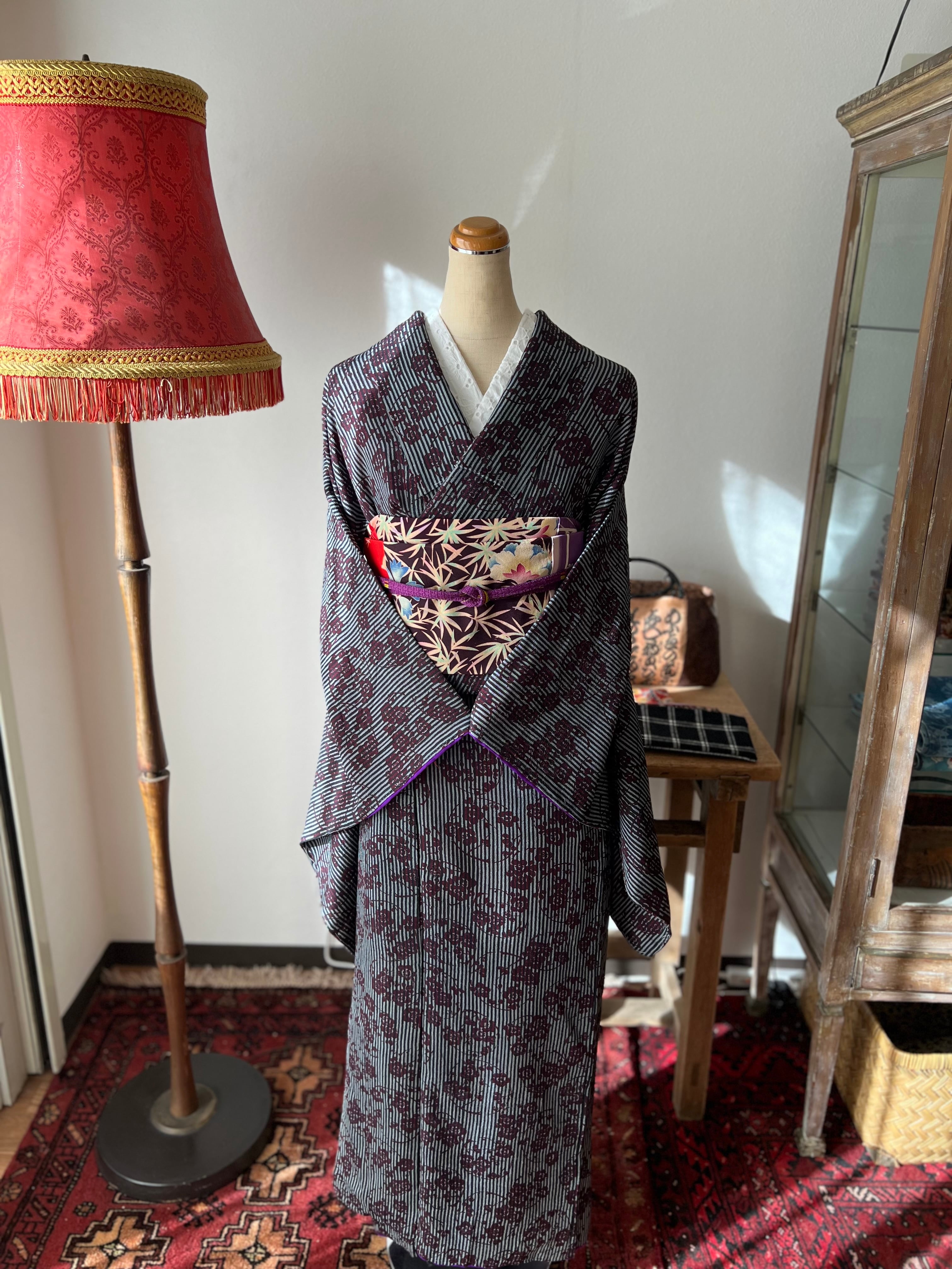 紫色にストライプ柄と梅の柄が