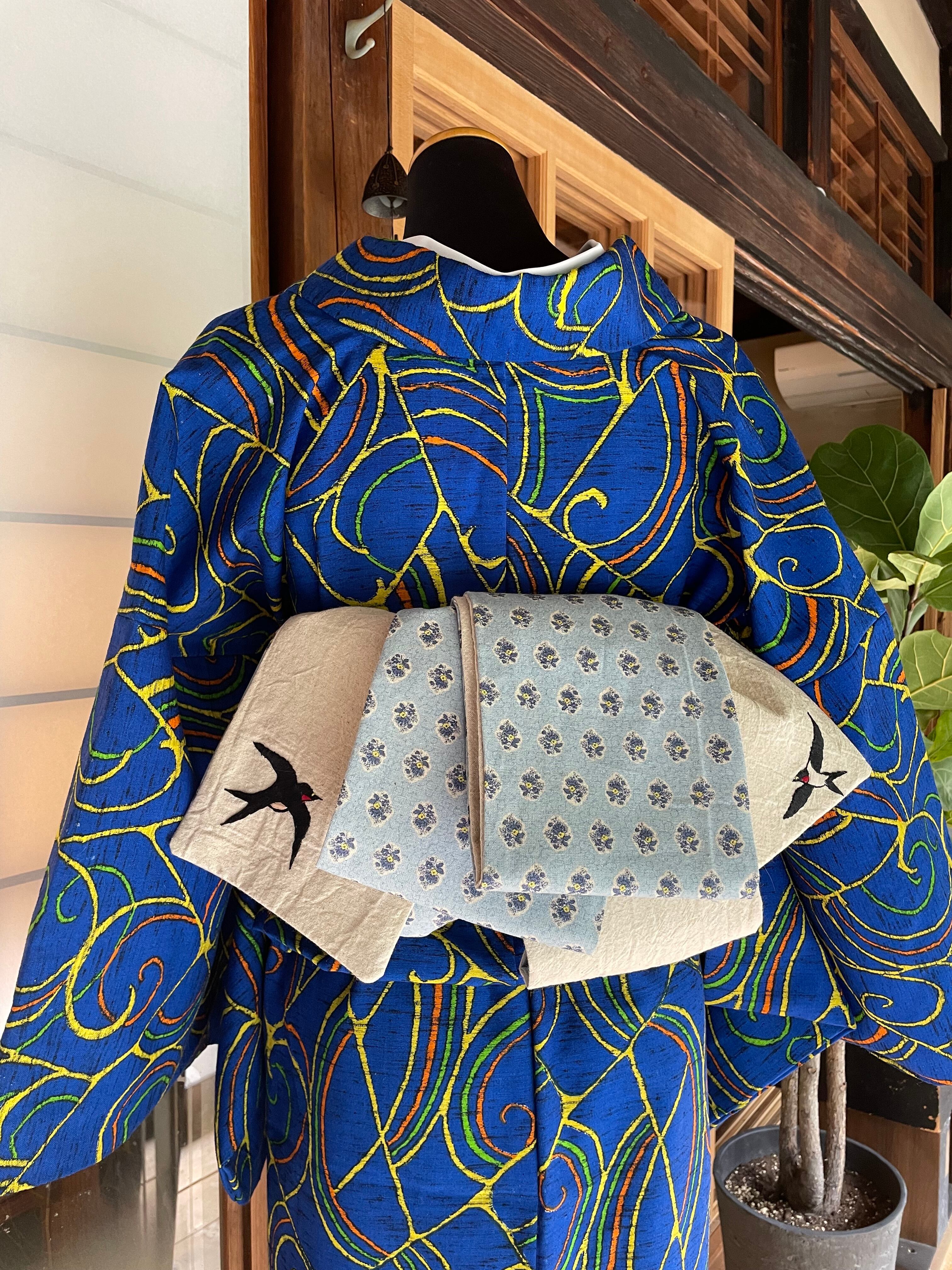 ハンドメイド半幅帯 つばめ刺繍